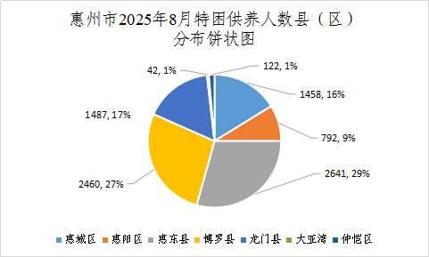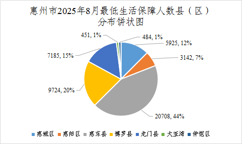 | 市縣區別 | 最低生活保障 | 特困供養 | | 戶數 | 人數 | 人數 | | 市合計 | 18783 | 47619 | 9002 | | 惠城區 | 2470 | 5925 | 1458 | | 惠陽區 | 1406 | 3142 | 792 | | 惠東縣 | 7837 | 20708 | 2641 | | 博羅縣 | 4008 | 9724 | 2460 | | 龍門縣 | 2676 | 7185 | 1487 | | 大亞灣 | 193 | 451 | 42 | | 仲愷區 | 193 | 484 | 122 |
