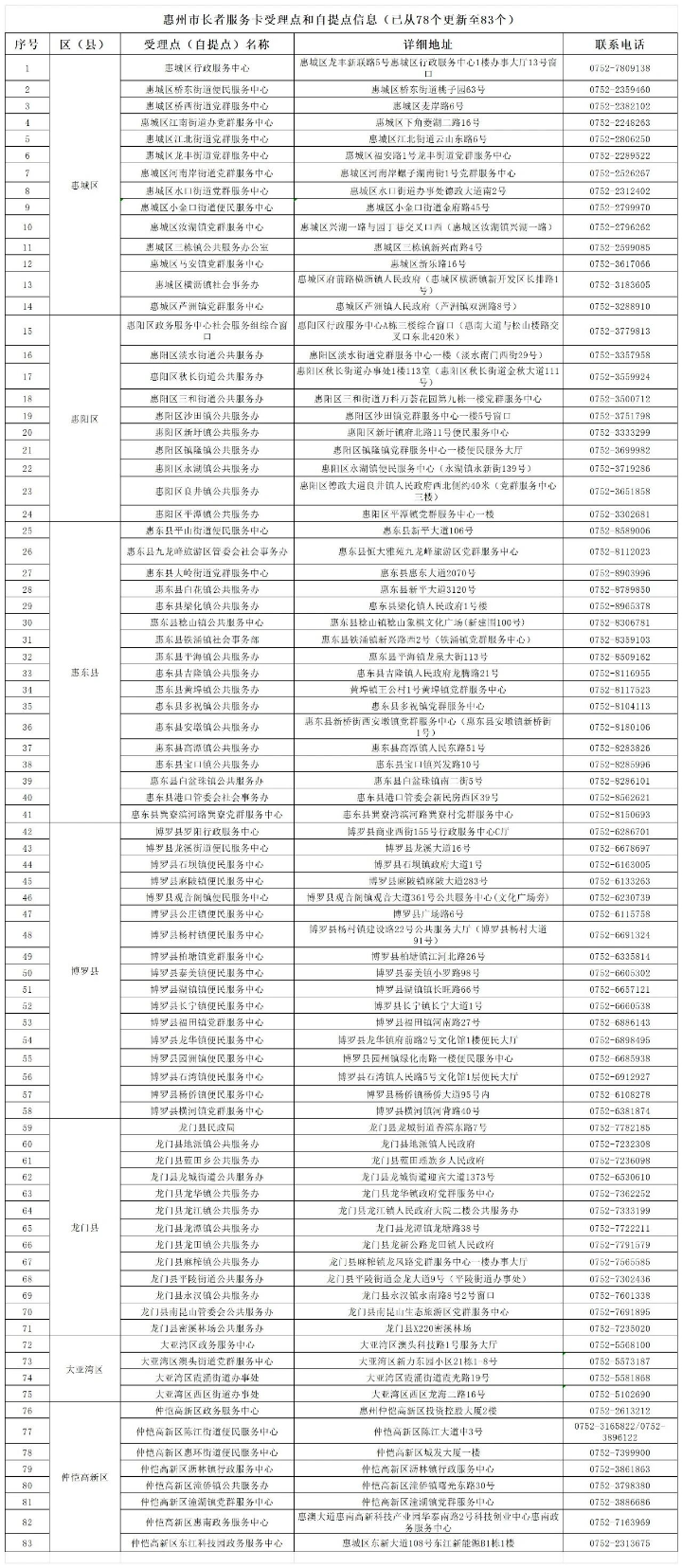 (點擊查看大圖) 四、辦理時限 10個工作日完成制發(fā)卡。 五、領(lǐng)取方式 (一)自取:自行到縣(區(qū))或鄉(xiāng)鎮(zhèn)(街道)黨群服務(wù)中心、公共服務(wù)辦、便民服務(wù)中心等政務(wù)服務(wù)窗口自提點取卡(不收取費用)。 (二)郵寄:郵寄費用需自行承擔(dān)(僅支持惠州市內(nèi)郵寄)。 六、優(yōu)待內(nèi)容 (一)年滿60周歲不滿65周歲老年人享受半價乘坐惠州市行政區(qū)域內(nèi)公交車服務(wù)。 (二)65周歲及以上老年人享受免費乘坐惠州市行政區(qū)域內(nèi)公交車服務(wù)。 七、其他說明 (一)長者服務(wù)卡首次申辦免制卡費,遺失、人為損壞等原因要求補辦的,由個人承擔(dān)制卡費用15元。 (二)年滿60周歲不滿65周歲老年人優(yōu)待乘車政策自2025年12月31日起實施,制卡系統(tǒng)正在配套改造升級,將于2025年12月17日后開放長者服務(wù)卡申辦服務(wù)。 (三)半價優(yōu)待的長者服務(wù)卡需到我市公共交通一卡通充值網(wǎng)點或線上充值后使用,免費優(yōu)待的長者服務(wù)卡無需充值。老年人年滿65周歲,半價優(yōu)待的長者卡自動轉(zhuǎn)為免費優(yōu)待,無需更換新卡。(全市各類充值網(wǎng)點詳細(xì)地址可在“惠州通”微信小程序上查詢)