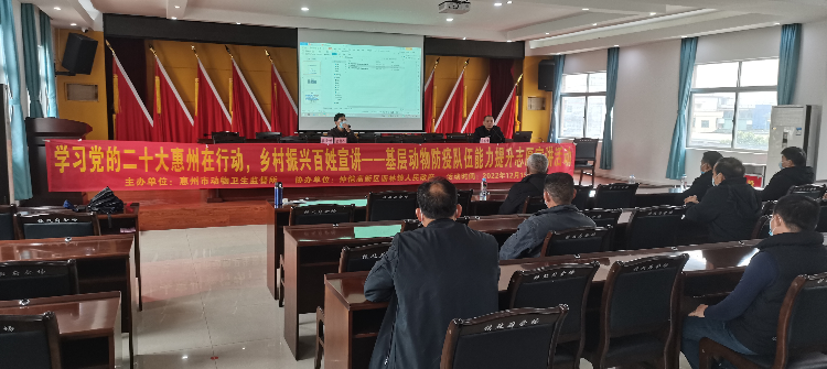 為深入學習宣傳貫徹黨的二十大精神,切實把思想統一到黨的二十大精神上來,把力量凝聚到黨的二十大確定的各項任務上來,惠州市動物衛生監督所按照上級部署,結合實際、積極謀劃,在全面學習、全面把握、全面落實“黨的二十大精神”上下功夫。12月15日上午,惠州市動物衛生監督所協同仲愷高新區瀝林鎮人民政府開展基層動物防疫隊伍能力提升志愿宣講活動,市農業農村局鄉村振興宣講隊成員鄧惠棠擔任主講,瀝林鎮獸醫站站長李登峰出席了活動,瀝林鎮村級防疫員15人參加。