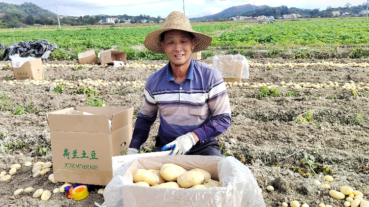 2月10日,在惠東縣稔山鎮五配村百畝連片冬種馬鈴薯示范基地里熱鬧不已,農戶們分工協作,揭膜、分級揀果、裝箱、打包、稱重、上車,技術專家和種植戶一同見證測產結果。