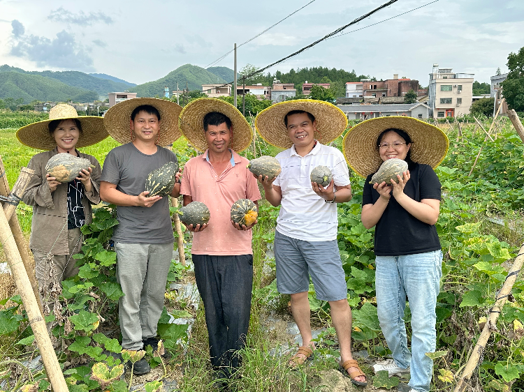 瓜熟蒂落,香甜萬家。6月6日,惠州市農(nóng)業(yè)科學(xué)研究所(以下稱“市農(nóng)科所”)農(nóng)村科技特派員團(tuán)隊(duì)聯(lián)合鄉(xiāng)村振興駐龍江鎮(zhèn)幫鎮(zhèn)扶村工作隊(duì)前往龍門縣龍江鎮(zhèn)羅洞村種植戶老林的蔬菜地里,對色澤橙黃、紋路清晰的香芋南瓜進(jìn)行現(xiàn)場產(chǎn)量測收和銷售調(diào)查。