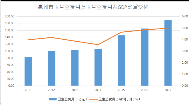 圖5:惠州市衛生費用及衛生總費用占GDP比重變化、人均衛生總費用變化