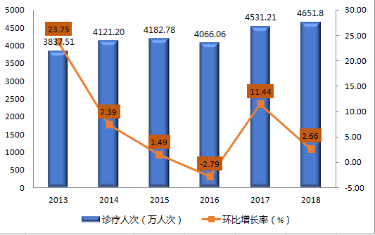 診療量:2018年,全市醫療衛生機構總診療人次達4651.80萬人次,其中:醫院1500.55萬人次,衛生院545.36萬人次,社區衛生服務機構369.53萬人次,村衛生室868.69萬人次,門診部238.82萬人次,診所.衛生所.醫務室839.36萬人次。與上年相比,醫療衛生機構診療人次增加120.59萬人次,增長2.66% (見圖6、表4)。