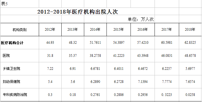 住院量:全市醫療衛生機構出院人次達628325人次,其中:醫院486578人次,衛生院56977人次,婦幼保健院76574人次。與上年相比,全市醫療衛生機構出院人次增加22344人次,增長3.69%(見圖6、表5)。