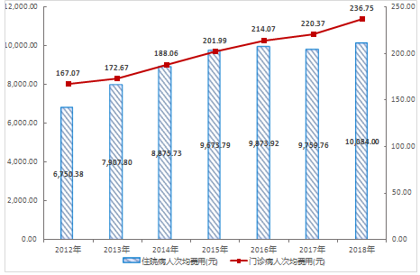 圖9 2011-2018年全市醫(yī)院次均門診和住院費(fèi)用