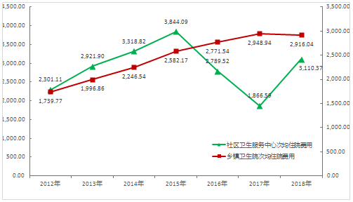 圖10 2011-2018年全市鄉(xiāng)鎮(zhèn)衛(wèi)生院、社區(qū)衛(wèi)生服務(wù)中心醫(yī)療費(fèi)用(元)