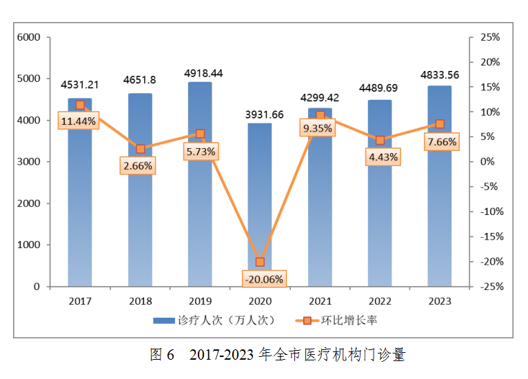 二、醫(yī)療服務(wù) 醫(yī)療機(jī)構(gòu)門診、住院量增加,基層診療人次占比提高。 (一)醫(yī)療服務(wù)量 診療量:2023年,全市醫(yī)療機(jī)構(gòu)總診療4833.56萬人次,其中:醫(yī)院1764.57萬人次,基層醫(yī)療機(jī)構(gòu)2751.43萬人次(內(nèi):衛(wèi)生院、社區(qū)衛(wèi)生服務(wù)機(jī)構(gòu)1208.26萬人次,村衛(wèi)生室490.66萬人次,門診部(所)1052.51萬人次),專業(yè)公共衛(wèi)生機(jī)構(gòu)317.56萬人次。總診療人次較上年增加7.66%。
