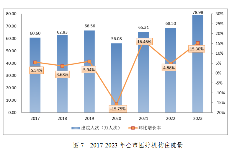 住院量:2023年,全市醫(yī)療機(jī)構(gòu)出院78.98萬人次,其中:醫(yī)院64.18萬人次,衛(wèi)生院6.07萬人次,婦幼保健院8.03萬人次,其他機(jī)構(gòu)0.70萬人次。出院人次總量較上年增加15.30%。