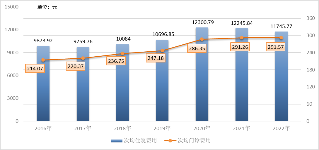 2016-2022年全市醫(yī)院次均門診和住院費用