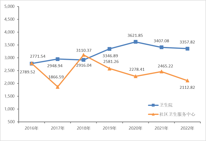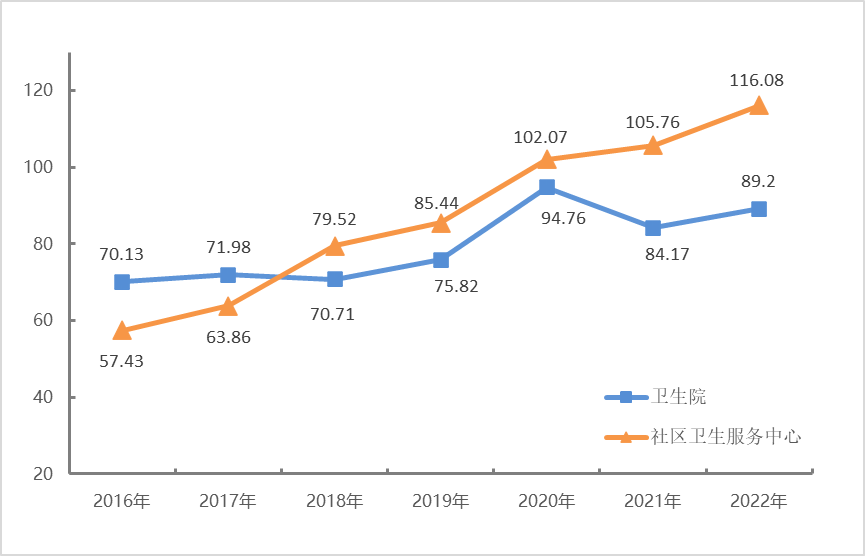 基層醫(yī)療機構(gòu)門診和住院費用。2022年,社區(qū)衛(wèi)生服務(wù)中心次均門診費用116.08元,較上年上漲9.76%;次均住院費用2112.82元,較上年下降14.29%。衛(wèi)生院次均門診費用、次均住院費用分別為89.20元、3357.82元,分別較上年上漲5.98%、下降1.45%。