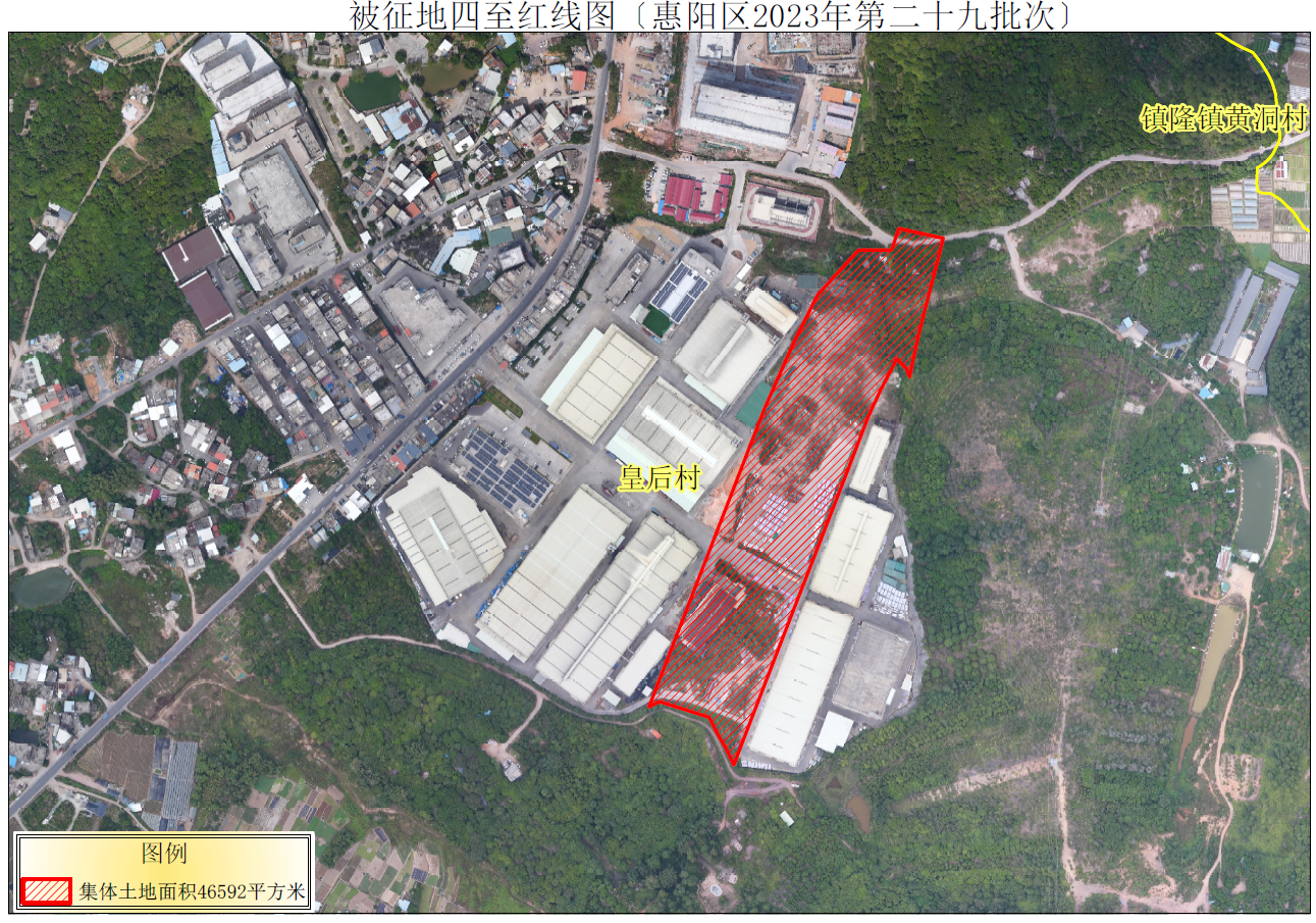 惠陽府告〔2023〕66號 為了公共利益需要,根據《中華人民共和國土地管理法》《中華人民共和國土地管理法實施條例》《廣東省土地管理條例》及《惠州市集體土地征收與補償辦法》(惠府〔2021〕27號)等法律法規,經惠州市惠陽區人民政府研究決定,擬征收惠州市惠陽區鎮隆鎮皇后村地段4.6592公頃集體土地作為惠州市惠陽區2023年度第二十九批次城鎮建設用地。現依法發布征收土地預公告: 一、擬征收土地的位置、范圍和面積 擬征收地塊位于惠州市惠陽區鎮隆鎮皇后村地段,屬惠州市惠陽區鎮隆鎮股份經濟聯合總社、惠州市惠陽區鎮隆鎮皇后村書房下股份經濟合作社、惠州市惠陽區鎮隆鎮皇后村石村股份經濟合作社所有的集體土地,面積合計4.6592公頃。四至范圍詳見附件《被征地四至紅線圖(惠陽區2023年度第二十九批次)》。 二、征收土地的征收目的 本次征收土地擬用于產業項目建設。 三、開展土地現狀調查安排 自本公告發布之日起,由惠州市惠陽區自然資源局會同惠州市惠陽區鎮隆鎮人民政府組織有關單位進行土地現狀調查,內容包括擬征收土地的權屬、地類、面積,以及農村村民住宅、其他地上附著物和青苗等的權屬、種類、面積、數量等信息。調查結果將與被征地的農村集體經濟組織、農民、青苗和地上附著物產權人共同確認,請各相關單位和個人相互告知,并予以配合。 四、其他事項 本預公告的公告期自2023年9月1日至2023年9月15日止。 自本預公告發布之日起,在擬征地范圍內,惠州市公安局惠陽區分局、惠州市惠陽區住房和城鄉建設局、惠州市惠陽區市場監督管理局、惠州市惠陽區自然資源局等有關部門暫停辦理下列事項,待征地補償工作完成后恢復辦理: (一)新批宅基地和其他建設用地。 (二)審批新建、改建、擴建房屋。 (三)辦理入戶和分戶,但因婚姻、出生、回國、退伍轉業、畢業生戶籍回遷、刑滿釋放等原因應當入戶、分戶的除外。 (四)以被征收土地上房屋為注冊地址辦理工商注冊登記、變更或其他審批、備案手續。 (五)改變土地、房屋用途。 (六)房屋、土地的轉讓、租賃和抵押。 自本預公告發布之日起,任何單位個人不得在擬征地范圍內搶栽搶建;違反規定搶栽搶建的,對搶栽搶建部分不予補償。 特此公告。 聯系人:李忠強;聯系電話:0752-3955033。 附件:被征地四至紅線圖(惠陽區2023年度第二十九批次)