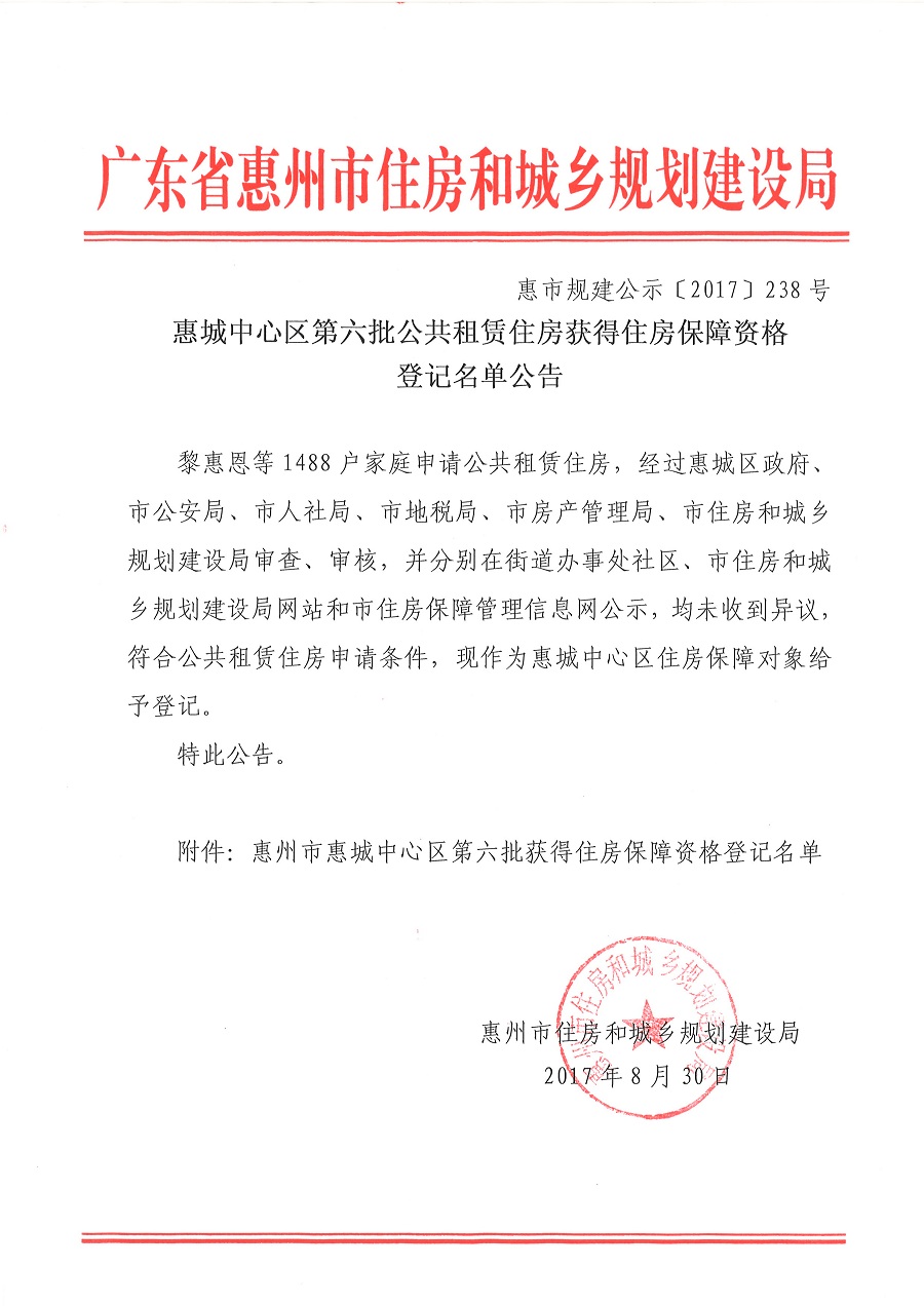 惠州市惠城中心區第六批獲得住房保障資格登記名單