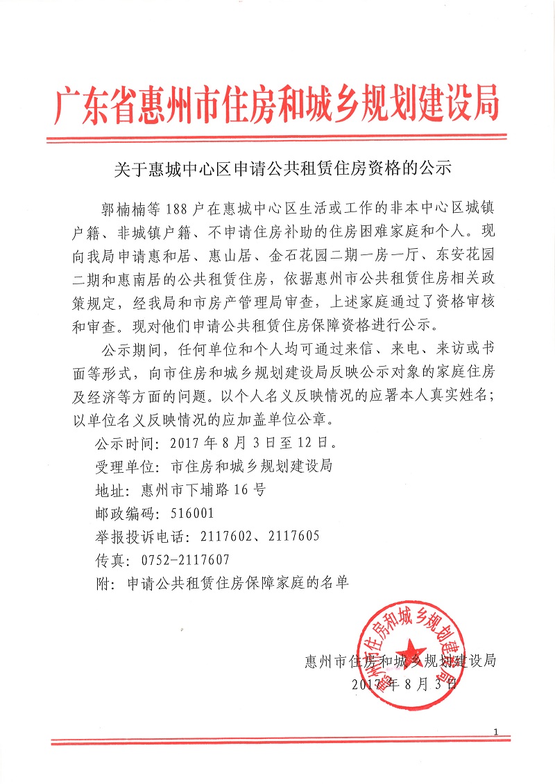 關于惠城中心區申請公共租賃住房資格的公示