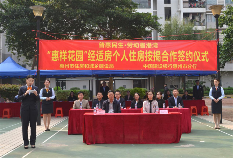 惠祥花園是我市保障性住房小區,為方便小區經濟適用房住戶辦理購買經濟適用房按揭手續,2019年2月27日上午,我局與中國建設銀行惠州分行在惠祥花園聯合舉辦“普惠民生、勞動者港灣暨惠祥花園經適房個人住房按揭合作”簽約儀式。我局副局長王摯平、中國建設銀行惠州分行行長張建雅出席活動。