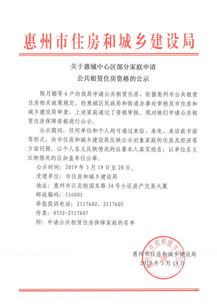 關(guān)于惠城中心區(qū)部分家庭申請(qǐng)公共租賃住房資格的公示