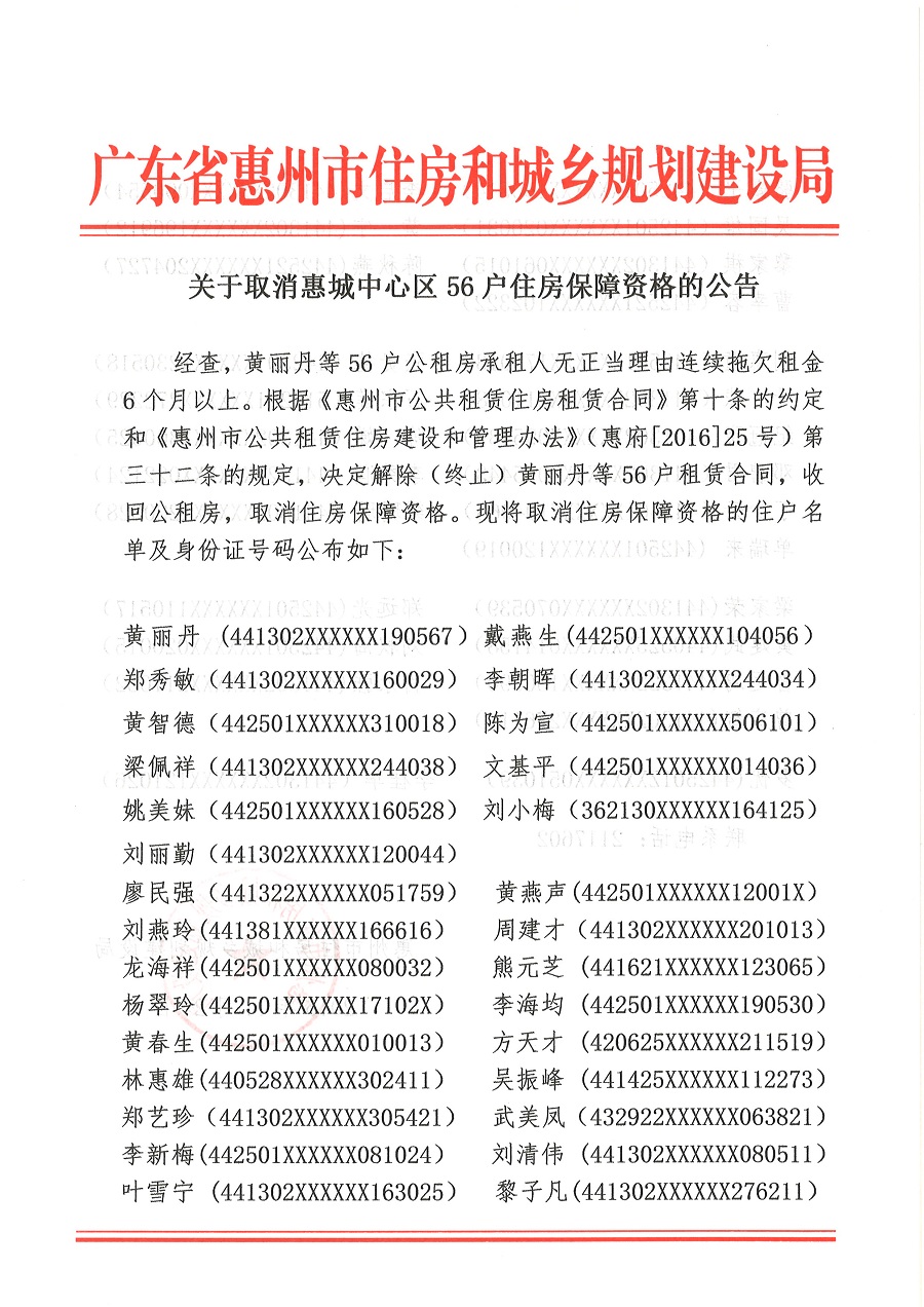 關(guān)于取消惠城中心區(qū)56戶住房保障資格的公告