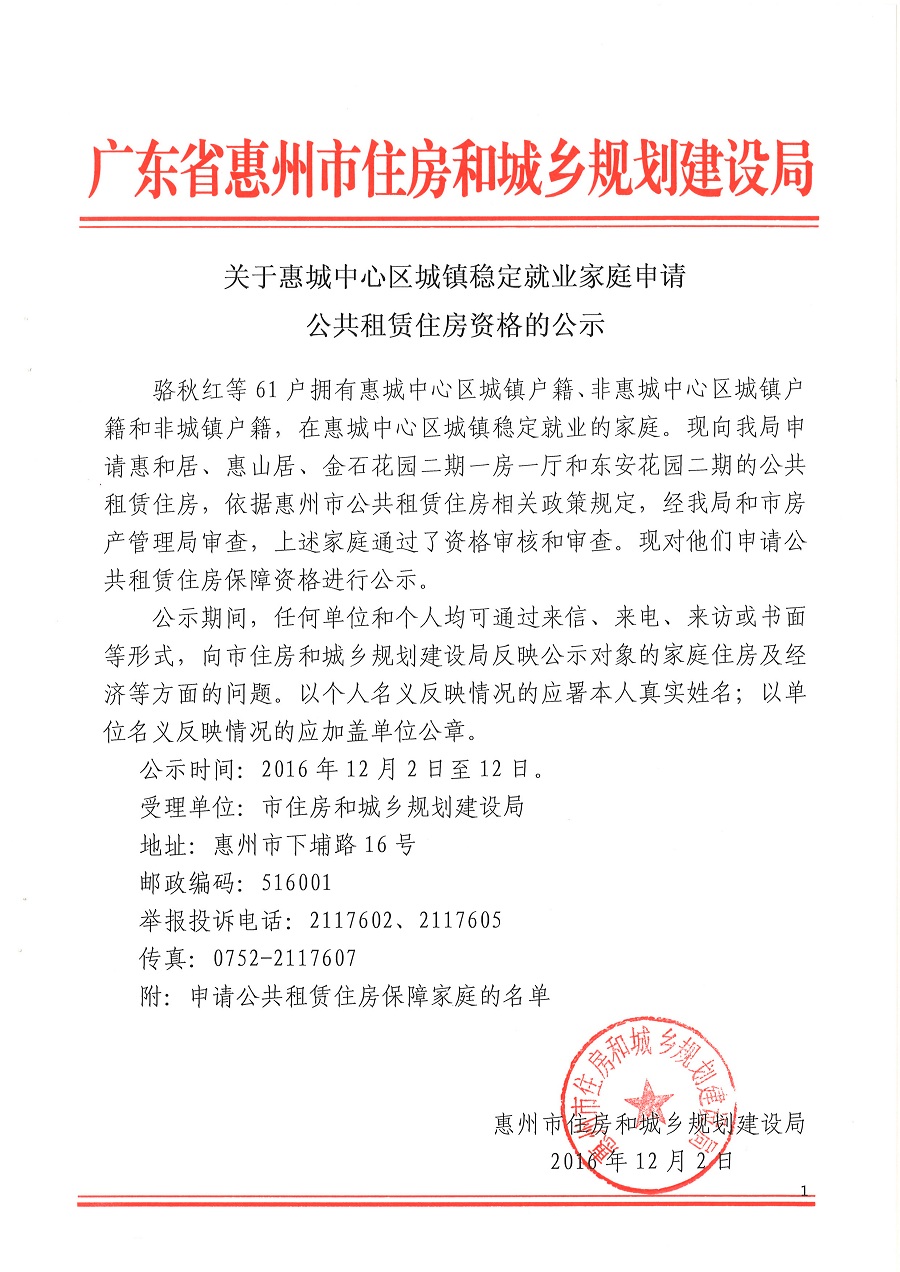 關于惠城中心區城鎮穩定就業家庭申請公共租賃住房資格的公示