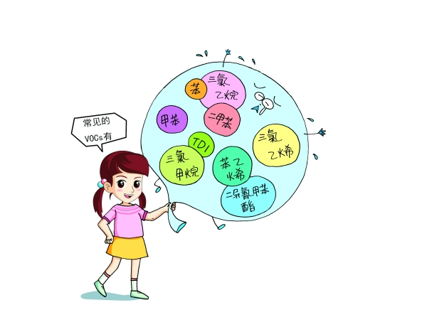 按揮發(fā)性有機(jī)化合物(VOCs)的化學(xué)結(jié)構(gòu)可進(jìn)一步分為8類:烷烴類、芳香烴類、烯烴類、鹵代烴類、酯類、醛類、酮類和其他化合物。從環(huán)保意義上講,主要指化學(xué)性質(zhì)活潑的那一類揮發(fā)性有機(jī)物。常見的VOCs有苯、甲苯、二甲苯、苯乙烯、三氯乙烯、三氯甲烷、三氯乙烷、二異氰酸酯(TDI)、二異氰甲苯酯等。