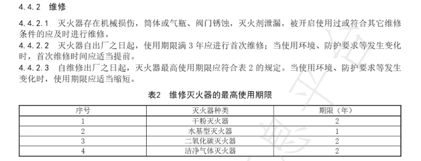 4.4.2.3自維修出廠之日起,滅火器最高使用期限應(yīng)符合表2的規(guī)定。當(dāng)使用環(huán)境、防護要求等發(fā)生變化時,使用期限應(yīng)適當(dāng)縮短。