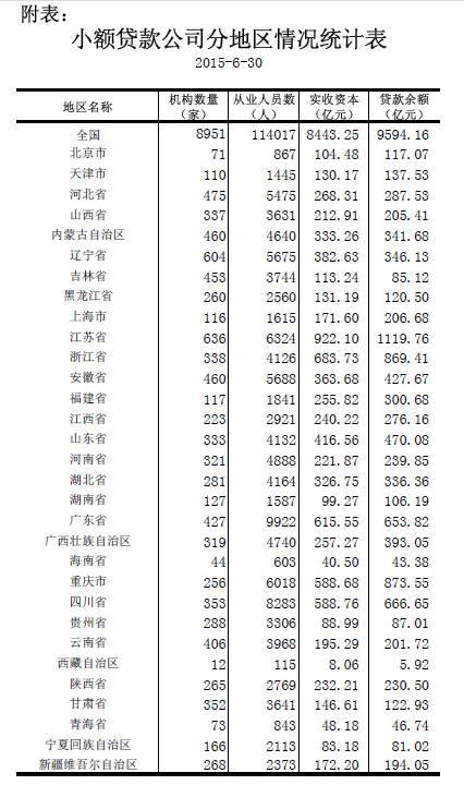 (央行網站)截至2015年6月末,全國共有小額貸款公司8951家,貸款余額9594億元,上半年新增人民幣貸款162億元。