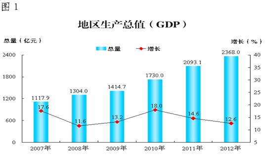 初步核算,全市生產(chǎn)總值(GDP)2368億元,比上年增長12.6%。其中,第一產(chǎn)業(yè)增加值127.6億元,增長4.3%;第二產(chǎn)業(yè)增加值1375.4億元,增長15.5%;第三產(chǎn)業(yè)增加值865.1億元,增長9%。三次產(chǎn)業(yè)結(jié)構(gòu)調(diào)整為5.4:58.1:36.5。2012年,惠州市人均GDP50884元,按平均匯率折算為8061美元。