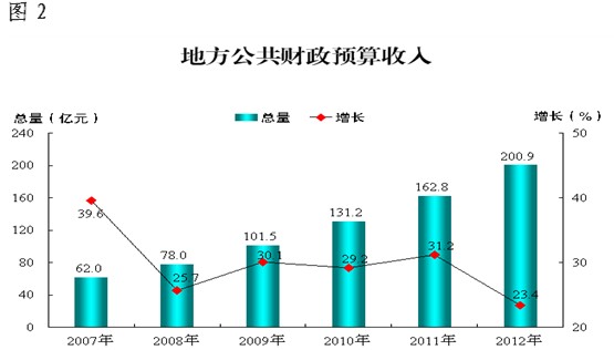 全市地方公共財(cái)政預(yù)算收入200.9億元,增長23.4%;地方公共財(cái)政預(yù)算支出274.1億元,增長20.6%。其中,教育支出62.6億元,增長47.2%;社會保障和就業(yè)支出22億元,增長11.8%;醫(yī)療衛(wèi)生支出21.8億元,增長21.4%;農(nóng)林水事務(wù)支出26.4億元,增長36.4%。稅收總收入704.3億元,增長19.5%。其中,國稅529.5億元,增長20.9%;地稅174.7億元,增長15.6%。