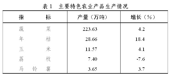 全市糧食作物播種面積181.38萬畝,比上年增長0.7%;糧食總產(chǎn)量62.66萬噸,增長2.8%;蔬菜總產(chǎn)量223.63萬噸,增長4.2%;水果總產(chǎn)量63.41萬噸,增長7.7%。
