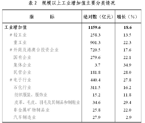 全年規(guī)模以上工業(yè)增加值1159.6億元,比上年增長18.6%。其中,電子行業(yè)完成增加值440.4億元,增長27.8%;石化行業(yè)完成增加值311.5億元,增長16.2%。電子行業(yè)、石化行業(yè)的增加值分別占規(guī)模以上工業(yè)的比重為38%、26.9%。規(guī)模以上工業(yè)企業(yè)實(shí)現(xiàn)銷售產(chǎn)值5426.2億元,增長20%,其中,內(nèi)銷產(chǎn)值3301.9億元,增長18.9%;出口交貨值2124.3億元,增長21.8%。內(nèi)外銷比例為60.9:39.1。
