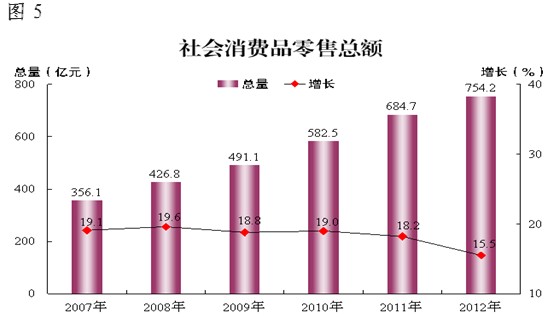 全年社會消費(fèi)品零售總額754.2億元,比上年增長15.5%。其中,城鎮(zhèn)消費(fèi)品零售額628.2億元,增長18.1%;鄉(xiāng)村零售額126億元,增長4%。分行業(yè)看,批發(fā)業(yè)零售額83.4億元,增長31%;零售業(yè)零售額599.9億元,增長13.7%;住宿業(yè)零售額14.8億元,增長15%;餐飲業(yè)零售額56.1億元,增長14.9%。從限額以上零售業(yè)看,汽車零售企業(yè)零售額增長25.9%;綜合零售企業(yè)零售額增長17.8%;機(jī)動車燃料油零售企業(yè)零售額增長3.6%;家電零售企業(yè)零售額下降12.5%。