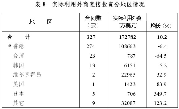 表8 實(shí)際利用外商直接投資分地區(qū)情況
