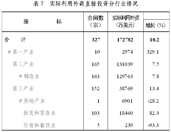 全年共簽訂外商直接投資項(xiàng)目合同327宗,下降23.1%;外商直接投資合同金額26.5億美元,增長22.5%;實(shí)際利用外商直接投資17.3億美元,增長10.2%。全年工商注冊新登記外商投資企業(yè)346家,新增注冊資金5.5億美元。年末全市工商登記外商企業(yè)實(shí)有6439家。其中,香港4132家;臺灣、英屬維爾京群島、薩摩亞合計(jì)870家;韓國155家;美國106家;日本65家;歐洲34家。