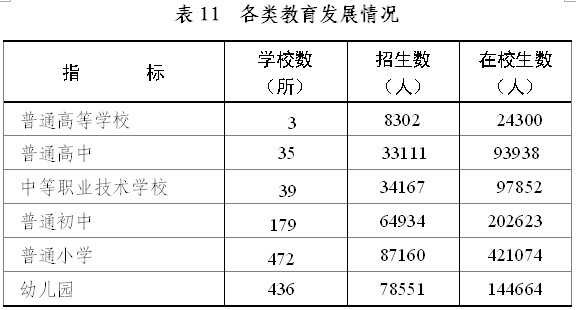 全市參加當(dāng)年高考被錄取的學(xué)生人數(shù)25674人,考入中專人數(shù)36797人,本科上線率41.4%;本地普通高等院校招生8032人;高中畢業(yè)生升學(xué)率89.65%;初中畢業(yè)生升學(xué)率98.51%;小學(xué)畢業(yè)生升學(xué)率100%;學(xué)齡兒童入學(xué)率100%。實(shí)現(xiàn)“鎮(zhèn)鎮(zhèn)皆教育強(qiáng)鎮(zhèn)”、“縣縣有示范高中”、鄉(xiāng)鎮(zhèn)中心幼兒園全部規(guī)范化。市東江高級中學(xué)建成,市衛(wèi)生學(xué)校升格為衛(wèi)生職業(yè)技術(shù)學(xué)院。