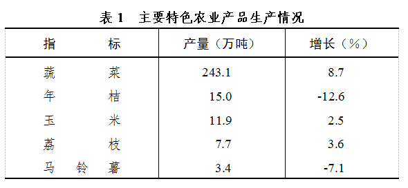 全市糧食作物播種面積175.0萬畝,比上年下降3.5%;糧食總產量55.7萬噸,下降11.1%;蔬菜總產量243.1萬噸,增長8.7%;水果總產量66.9萬噸,增長5.6%。
