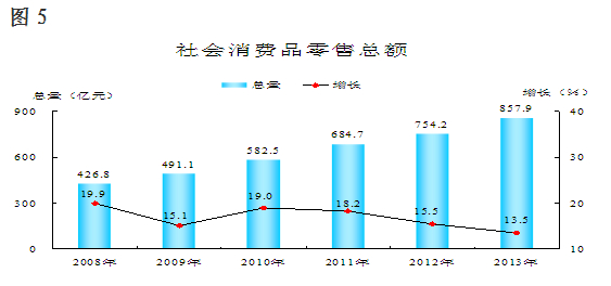 全年社會消費品零售總額857.9億元,比上年增長13.5%。分地域看,城鎮消費品零售額707.5億元,增長15.4%;農村消費品零售額150.4億元,增長6.4%。分行業看,批發業零售額96.2億元,增長14.9%;零售業零售額685.6億元,增長14.4%;住宿業零售額15.2億元,增長1.8%;餐飲業零售額60.9億元,增長8.3%。
