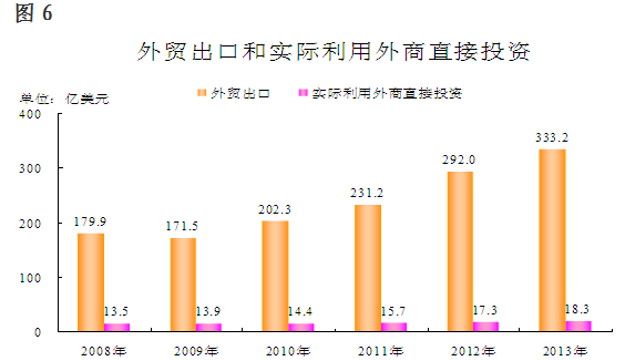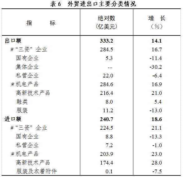 全年外貿進出口總額573.9億美元,比上年增長16.0%。其中,出口333.2億美元,增長14.1%;進口240.7億美元,增長18.6%。進出口差額(出口減進口)92.5億美元,比上年增加3.4億美元。