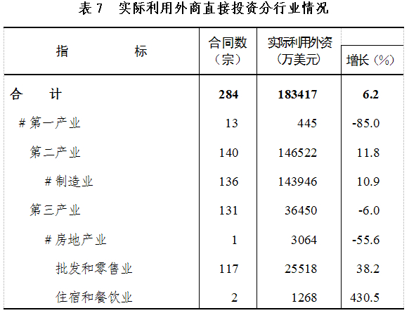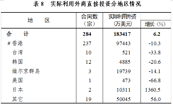 全年共簽訂外商直接投資項目合同284宗,下降13.1%;外商直接投資合同金額28.9億美元,增長8.9%;實際利用外商直接投資18.3億美元,增長6.2%。全年工商注冊新登記外商投資企業339家,新增注冊資金6億美元。年末全市工商登記外商企業實有6627家。其中,香港4292家;臺灣、英屬維爾京群島、薩摩亞合計871家;韓國163家;美國103家;日本67家;歐洲34家。