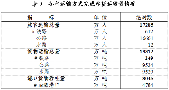 年末全市境內公路通車里程總長11234公里。其中等級公路10703公里,高速公路492公里。通車里程公路密度為99公里/百平方公里;等級公路密度為94公里/百平方公里。全年沿海港口完成貨物吞吐量4784萬噸,其中港口集裝箱吞吐量112萬噸。