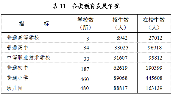 全市參加當年高考被錄取的學生人數27845人,考入中專人數30095人;本地普通高等院校招生8942人;高中畢業生升學率92.85%;初中畢業生升學率98.7%;小學畢業生升學率100%;學齡兒童入學率100%。全市承擔的推進義務教育發展國家教育體制改革試點項目獲批轉為全國示范項目。惠陽區、惠城區、大亞灣區和仲愷區被授予“廣東省推進教育現代化先進區”稱號。
